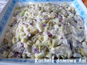 3. Zielony groszek odsączamy, wrzucamy do sałatki. Ogórki korniszone kroimy w grubszą kostkę. Wszystko razem mieszamy, dodajemy majonez i śmietanę, doprawiamy do smaku. Przed podaniem schładzamy w lodówce, by smaki się przegryzły.