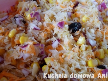 1. Kapustę poszatkować, dodać startą na dużych oczkach marchewkę, pokrojone w kostkę jabłko, cebulę, dodać odsączoną kukurydzę i rodzynki.