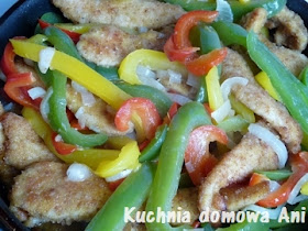 3. Do mięsa dodajemy cebulę i paprykę, doprawiamy solą, dolewamy oleju i odrobinę wody, by warzywa się nie przypaliły. Dusimy pod przykryciem ok. 10 minut.