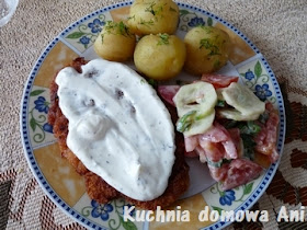 4. Do śmietany dodajemy zioła prowansalskie. Na usmażone kotlety dajemy po łyżce śmietany i rozprowadzamy równomiernie.