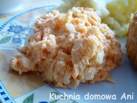 Pyszna surówka obiadowa pasująca przede wszystkim do wszelkich rodzajów mięs. Jak widać na poniżej załączonym zdjęciu, podałam ją do ziemniaków i kotletów z kapustą. Przepis znalazłam na blogu Fabryka Przepisów.