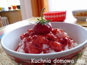 2. W międzyczasie robimy sos, umyte truskawki rozgniatamy widelcem lub miksujemy, dodajemy jogurt naturalny i cukier do smaku. Mieszamy.