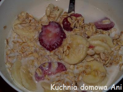3. Płatki przekładamy do miski, zalewamy mlekiem (można zastąpić jogurtem naturalnym), dodajemy owoce i ewentualnie miód.