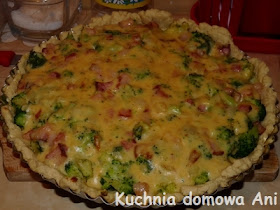 8. Na podpieczone ciasto dodajemy najpierw brokuła, porem boczek z cebulą i całość zalewamy sosem beszamelowym. Całość pieczemy ok 30 minut. Podajemy na gorąco.