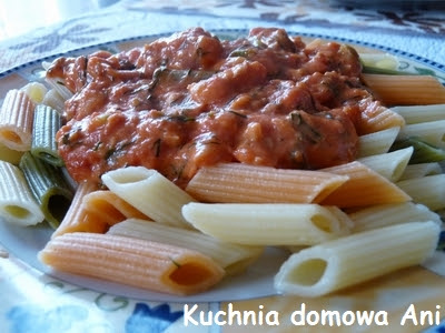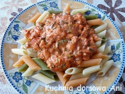 Propozycja na bardzo szybki obiad. Sos spokojnie zdążymy przygotować w czasie, kiesy gotuje się makaron. Przepis znalazłam u Mniamu.