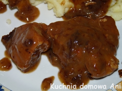 2. Śliwki pokroić w paseczki, dodać do mięsa i gotować kolejną godzinę (lub do miękkości).