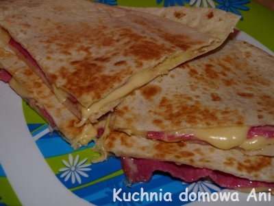 1. Tortillę kładziemy na suchej patelni i delikatnie podgrzewamy. Szybko rozkładamy na niej 2 plasterki salami i połowę tartego żółtego sera. Przykładamy drugim plackiem tortilli. Smażymy ok 30 sekund, przekładamy na drugą stronę i smażymy znów 30 sekund. Przekładamy na talerz i kroimy na 4 części lub na więcej trójkątów.