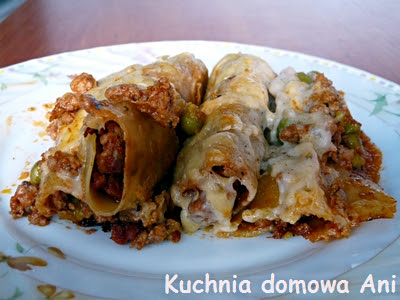 3. Surowe cannelloni napełniamy farszem mięsnym, układamy jednowarstwowo w naczyniu żaroodpornym wysmarowanym olejem. Całość polewamy sosem beszamelowym. Przykrywamy pokrywką i pieczemy przez 15 minut w 200 st. C. Następnie całość posypujemy tartym żółtym serem i zapiekamy już bez przykrycia przez 20-25 minut.