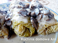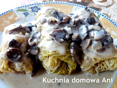 Kapusta włoska idealnie nadaje się na gołąbki - po zapieczeniu jest mięciutka i bardzo smaczna. Do gołąbków zrobiłam dwa sosy - pieczarkowy dla mnie i pomidorowy dla męża. Sama też pierwszy raz jadłam gołąbki z sosem pieczarkowym - moim zdaniem są o niebo lepsze od tych z sosem pomidorowym. Ale to już kwestia smaku.