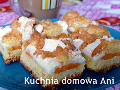 3. Blaszkę wyłożyć papierem do pieczenia, a następnie wyłożyć większe kruche ciasto. Na cieście rozłożyć morele, a na owoce ubitą pianę. Na pianę zetrzeć na tarce o dużych oczkach zamrożone ciasto.