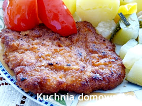 3. Składniki panierki mieszamy. Kotlety najpierw panierujemy w mące, następnie w jajku z mlekiem, a na końcu w paprykowej panierce. Smażymy na dobrze rozgrzanym oleju.