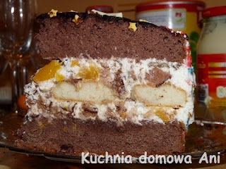 1. Zrobić biszkopt, ubić białka, dodawać stopniowo cukier, żółtka, obydwie mąki i kakao, proszek do pieczenia. Przelać ciasto do tortownicy i upiec, a potem przestudzony biszkopt przekroić na pół.
