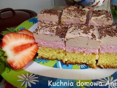 1. Robimy biszkopt: ubijamy białka ze szczyptą soli, następnie dodajemy cukier, żółtka, ubijamy, a na koniec dodajemy proszek do pieczenia, mąkę i proszek budyniowy. Biszkopt pieczemy "do suchego patyczka". Studzimy.