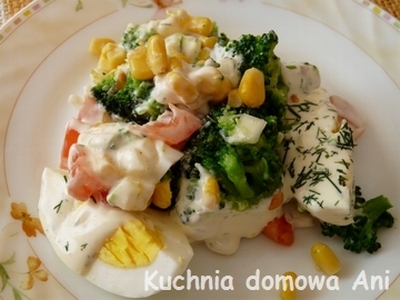 2. Cebulę i pomidor pokroić w kostkę.3. W salaterce układamy połowę brokuła, połowę kukurydzy, połowę pomidorów z cebulą, połowę jajek pokrojonych na ćwiartki, czynność powtarzamy, tak, aby ostatnią warstwą były jajka.