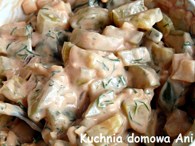 1. Ogórki kroimy w kostkę, a cebulę drobno siekamy.
